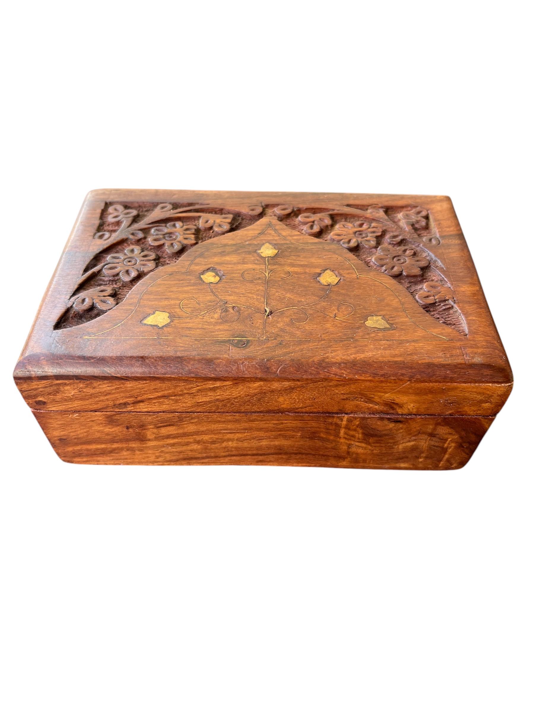 Caixa Madeira Indiana Artesanal, marchetada, arte que une materiais como madeira e metais como bronze para criar desenhos e formas diferentes, exclusivos. Forro de veludo vermelho ideal para decoração com a função de guardar pequenos objetos.